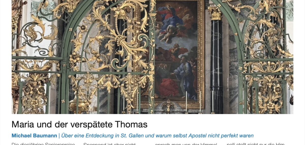 Editorial von Michael Baumann: «Maria und der verspätete Thomas» | Kerzenziehen – Freiwillige gesucht | Aus der Kirchenpflege |Rückblick – Seniorenreise | Rückblick – Sommerlager | Ökum. Erntedank-Gottesdienst | Chilbi | Spezialnachmittag zum Thema Demenz | Seniorennachmittage 2025/2026 | Mitenand-Ferien 2026 | Musik in der Kirche | Chinderchile | Kolibri | Skulpturen-Aussstellung | Meditationskurs